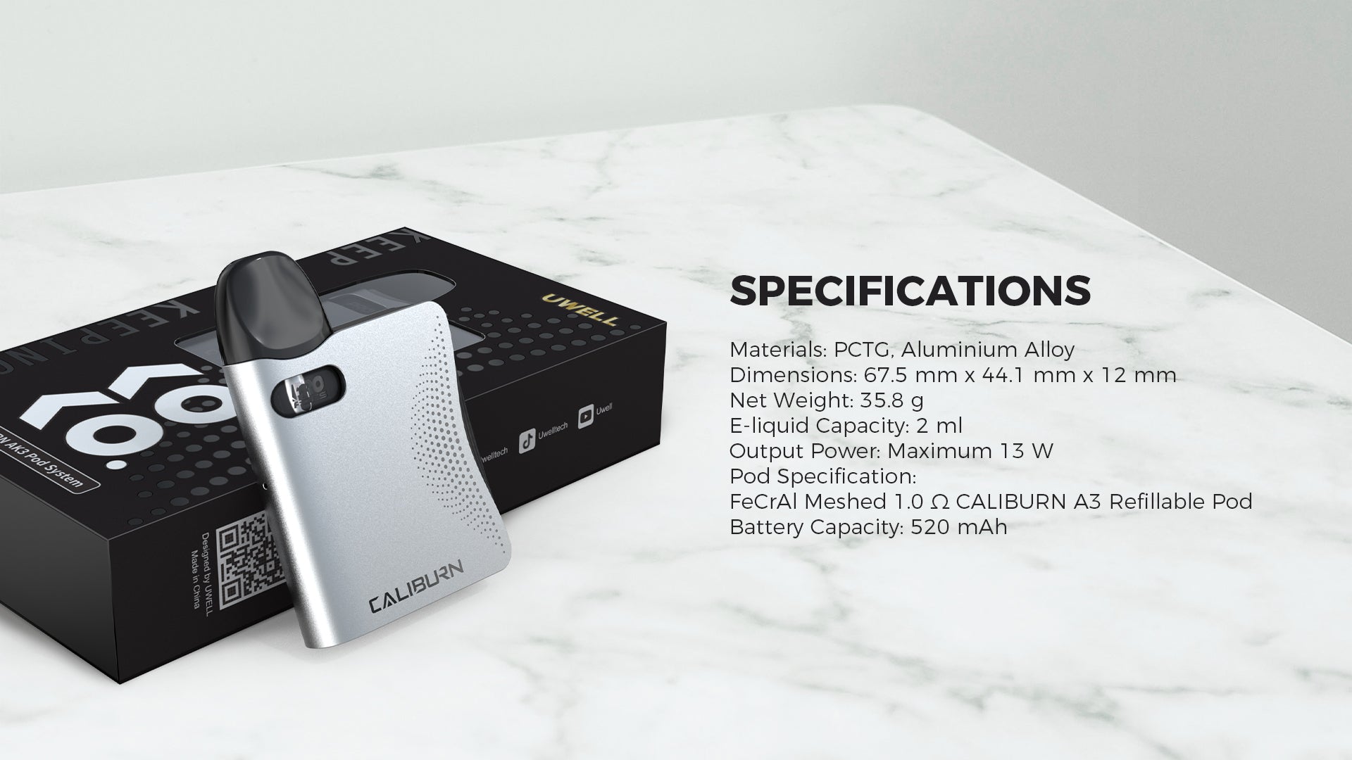 The Uwell Caliburn AK3 Pod Kit is an ultra portable pod system as the 3rd generation of Caliburn KoKo Prime. Powered by a 520mAh built-in battery, the Caliburn AK3 adopts a draw activated firing system reaching up to 13W output.