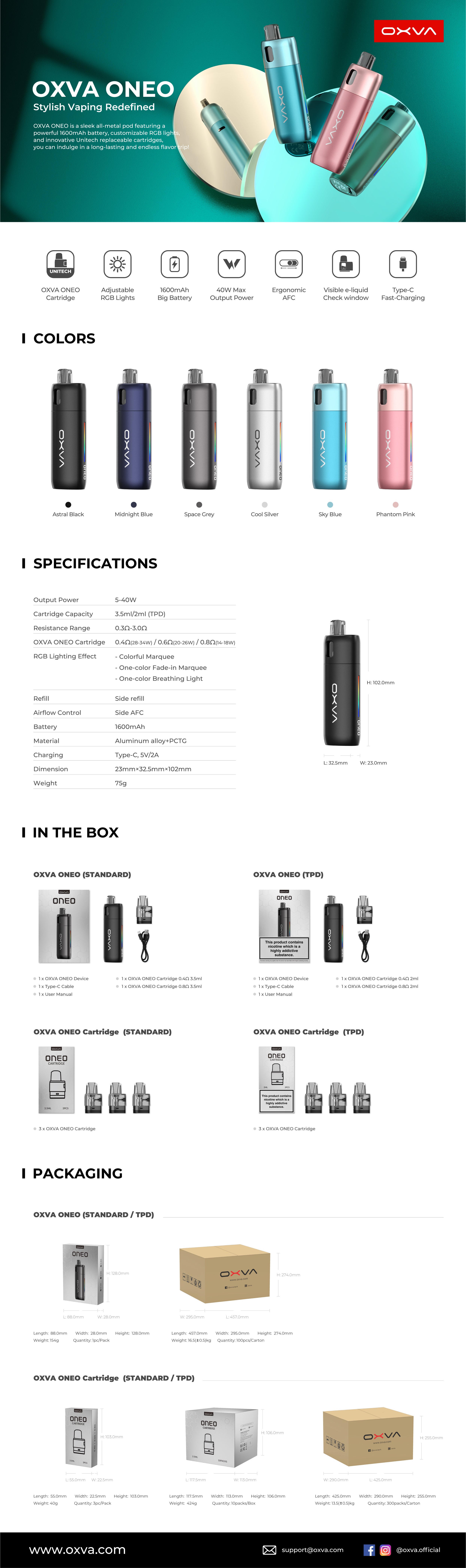 The Oxva Oneo Pod Kit is a solid and robust pod vaping kit featuring a huge 1600 mAh built-in battery, customisable RGB lighting display and ergonomic airflow control for a long-lasting and endless flavour experience.