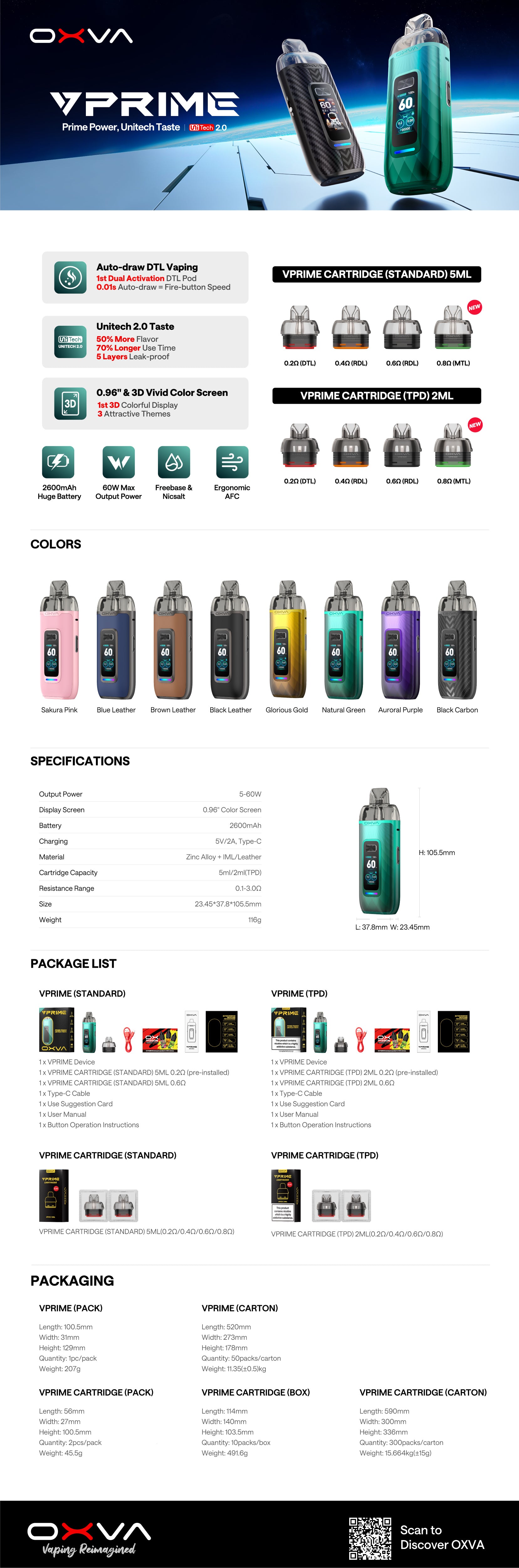 The Oxva VPRIME is the first ever Auto-Draw DTL Pod system featuring a vivid 0.96-inch color screen, offering ultra-realistic 3D visual experience and user-friendly interactions.