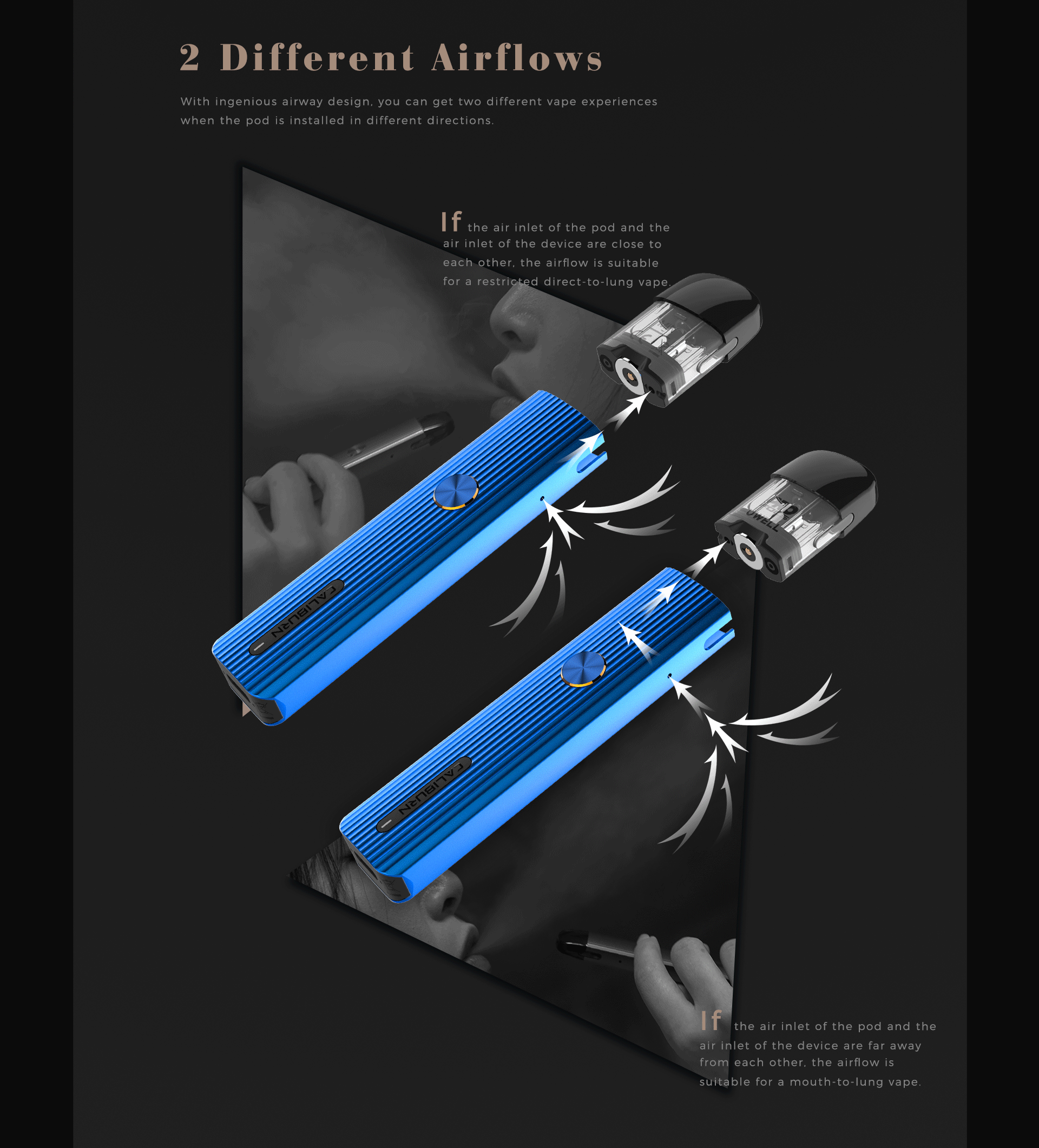 Uwell Caliburn G Pod System Kit 690mAh, the upgrade version of Caliburn, works with 690mAh built-in battery and can fire up to max 15W output. Uwell Caliburn G Pod kit can vape directly through air pressure sensor or manual button to start vaping. Uwell Caliburn G cartridge comes with 2ml capacity with top-fill and leakproof design. Uwell Caliburn G pod supports two different airflows: restricted DTL vaping (when the air inlet of the pod and the air inlet of the device are close to each other) and MTL vaping (when the air inlet of the pod and the air inlet of the device are far away from each other).